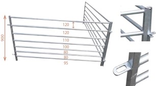Mit Trogausschnitt Höhe: 900 mm, 7 Rohre 26,9x20 mm mit Bodentränkeausschnitt Verschiedene Abmessungen: leichte Horde (Abtrennung) L: 1200 mm leichte Horde (Abtrennung) L: 2400 mm leichte Horde (Abtrennung) L: 3000 mm
